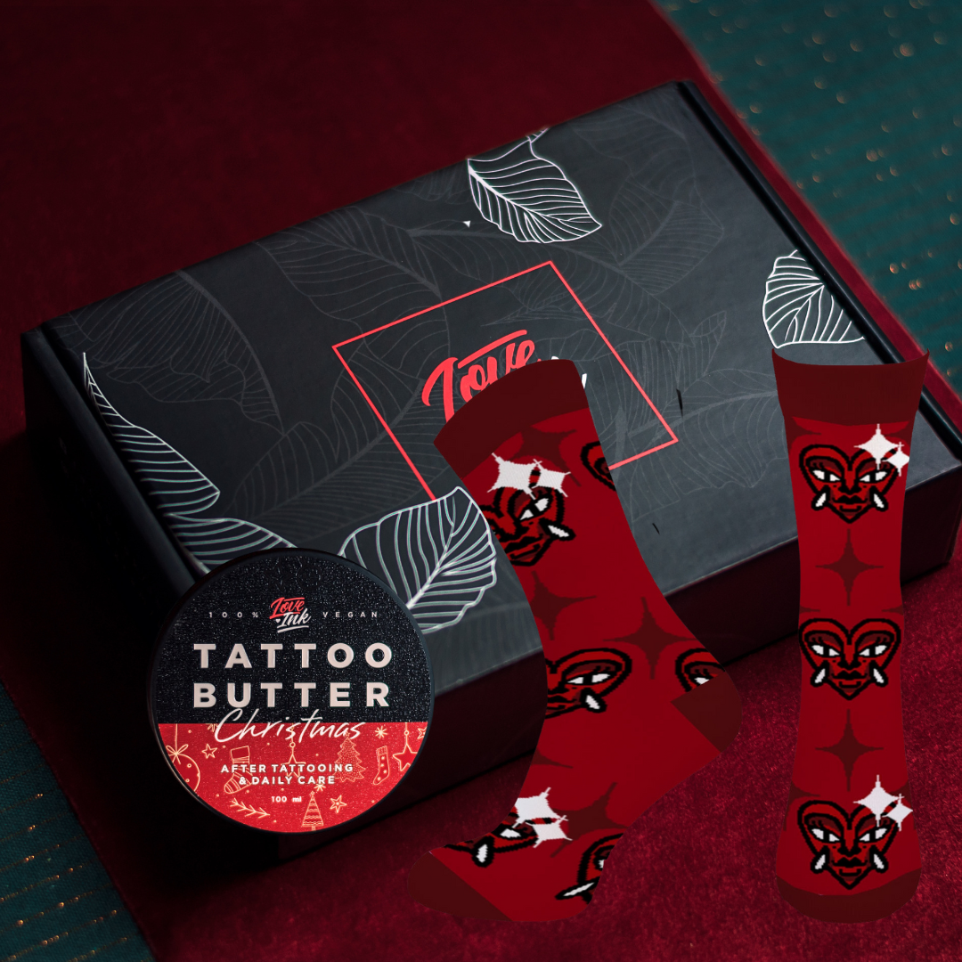 This couple's set includes our new Tattoo Butter Christmas and two pairs of socks with matching designs. Nothing brings you closer together than matching clothes. The recipe for the perfect winter evening - slip into matching socks first and then under a warm blanket. Don't forget to take care of your tattoos beforehand by treating them with Tattoo Butter Christmas to fully enjoy the scent and atmosphere of Christmas.